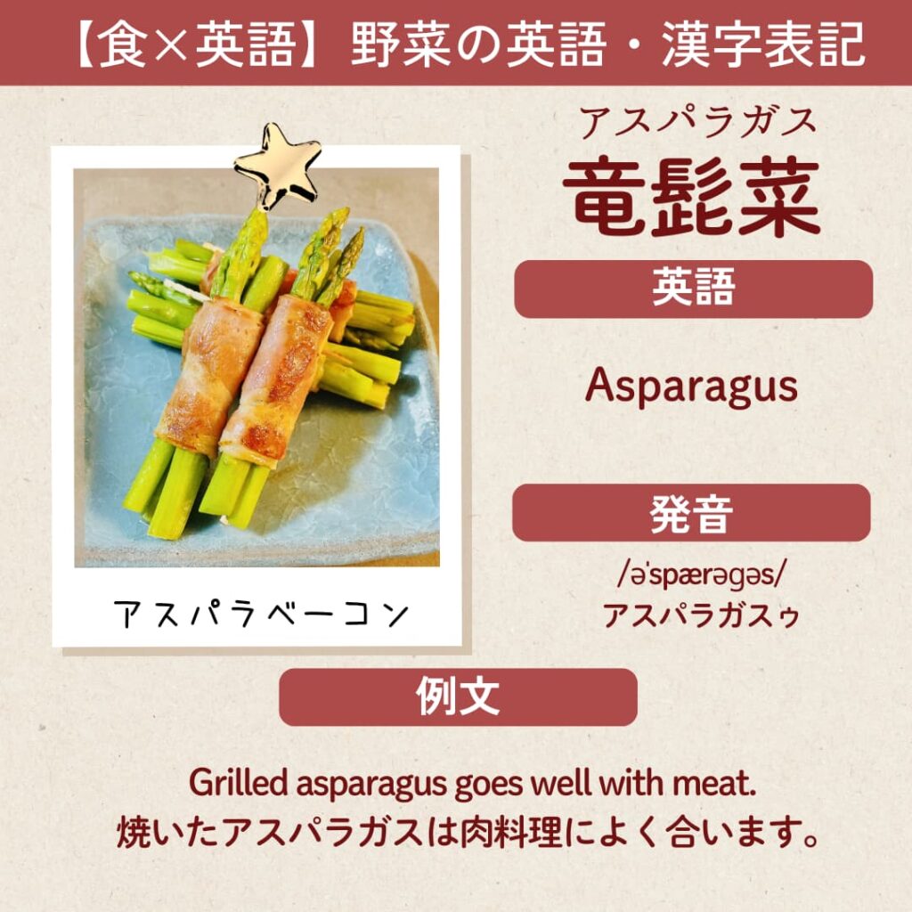 アスパラガスの漢字表記は「竜髭菜(りゅうきゅうさい)」と書きます。
