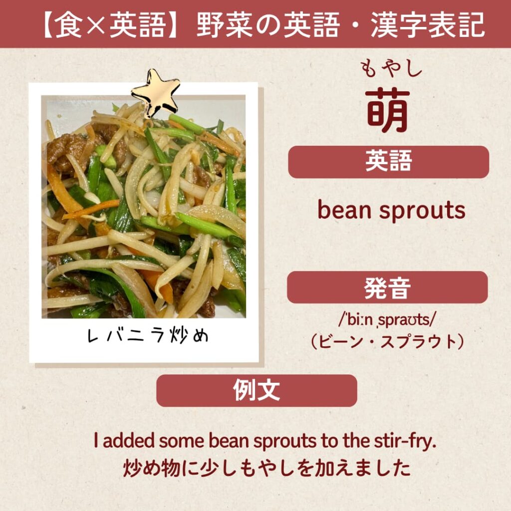 「萌」は“芽が出る”という意味で、古くは「萌やし豆」「発芽豆」とも呼ばれていました。現在は仮名表記(もやし)が一般的です。