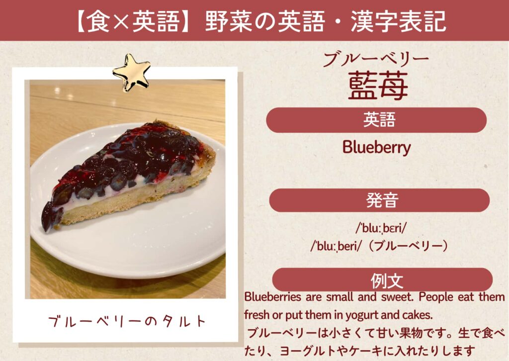 - 発音記号:/ˈbluːˌbɛri/ または /ˈbluːˌberi/(ブルーベリー)