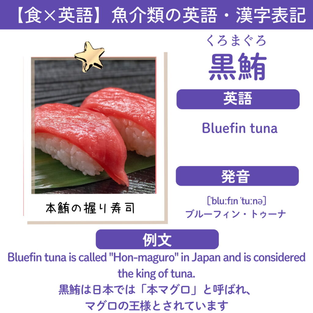 英語では Bluefin tuna(ブルーフィン・トゥーナ) と呼ばれ、国際的にも高級魚として知られています。