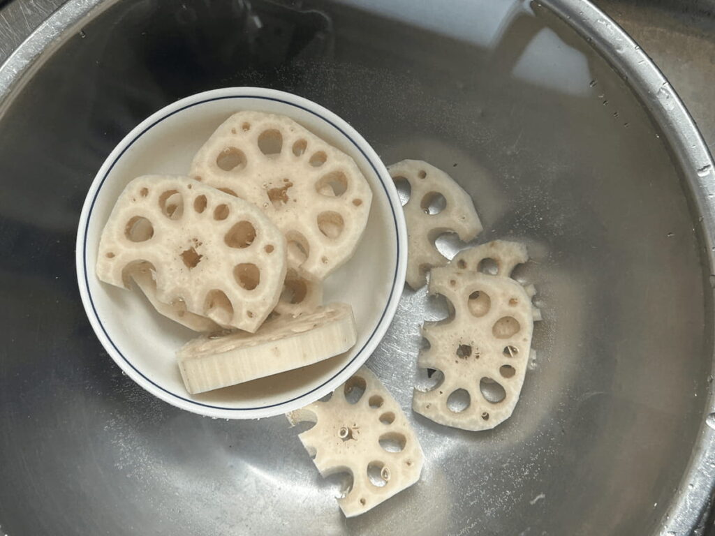 鍋に水と酢を入れ、沸騰したら蓮根を加える。