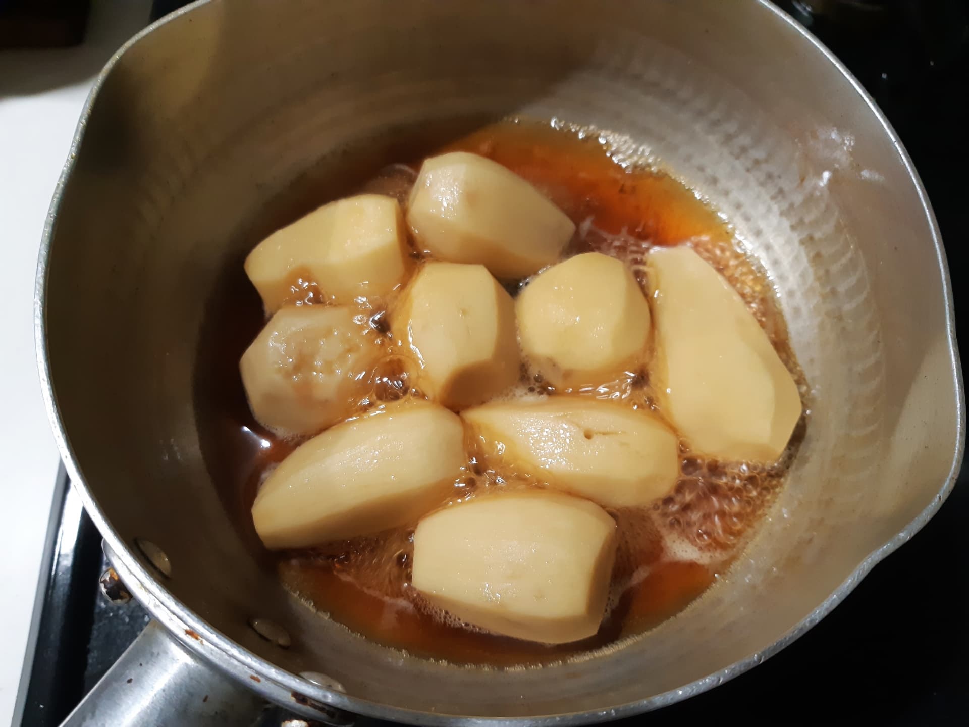 沸騰直前で弱火にし、下茹でした里芋を加える。 - 含め煮る(弱火)