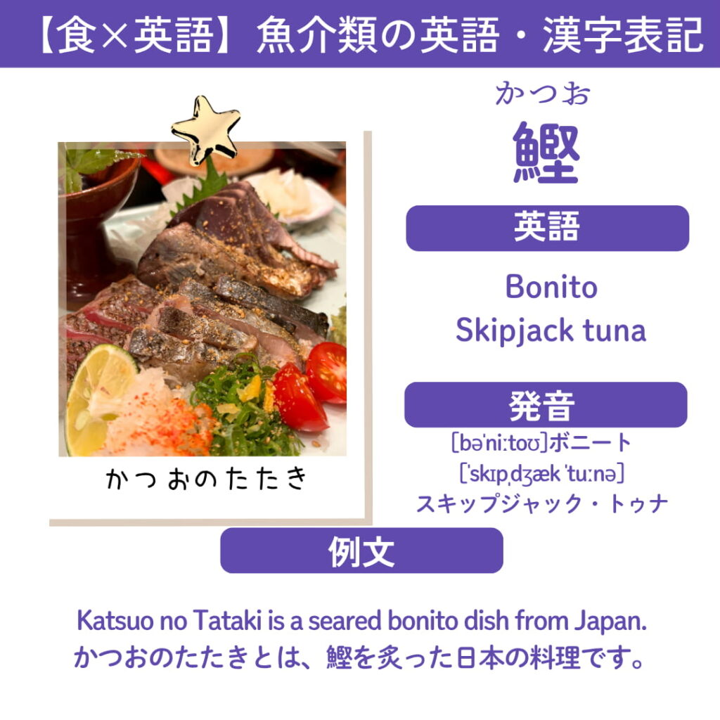 • 英語圏での料理表記では「Bonito flakes(鰹節)」や「Seared bonito(たたき風)」などの表現が使われることもあります。