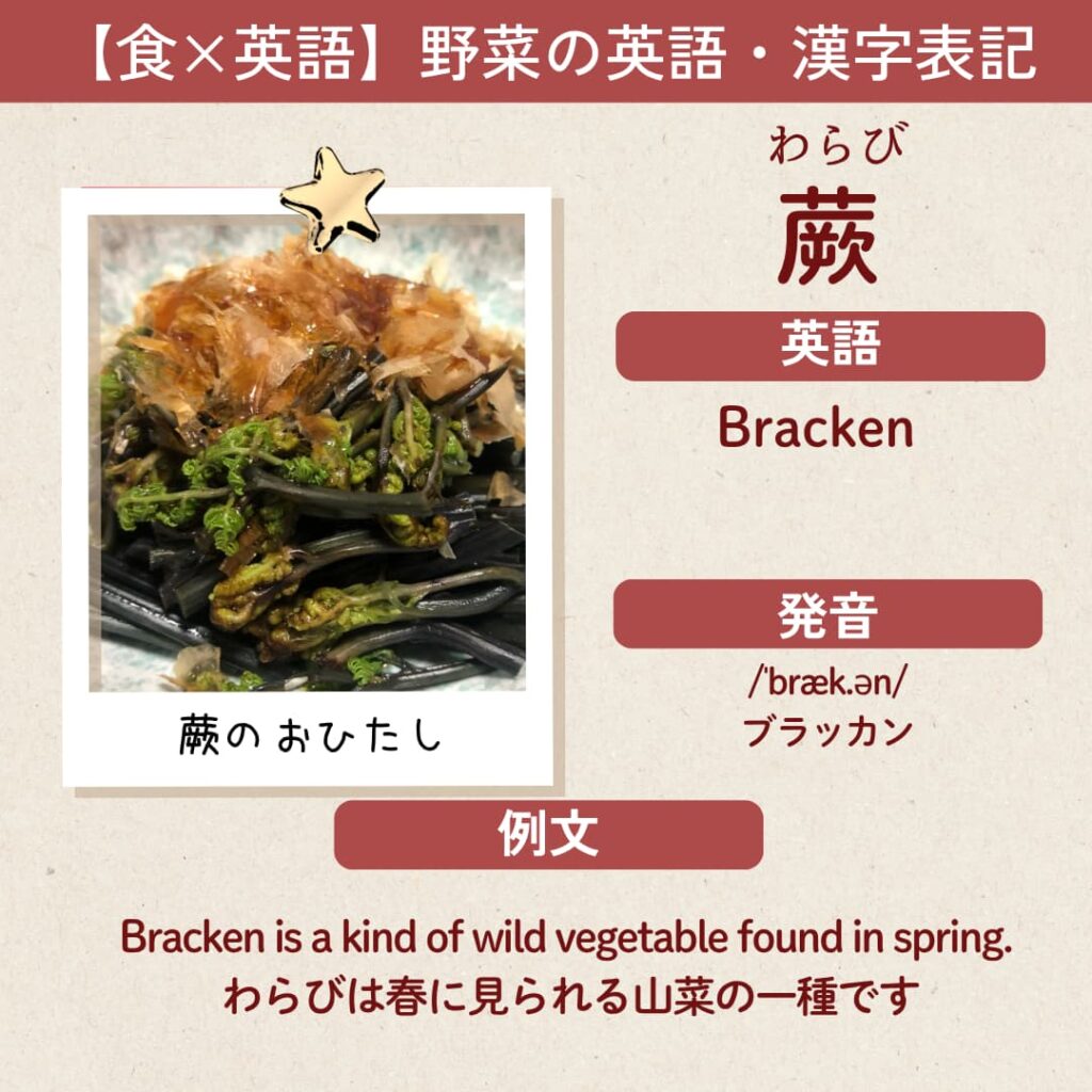 わらび(蕨)は、シダ植物の一種で、春に芽吹く若芽を食用とする山菜です。学名は Pteridium aquilinum(プテリディウム・アクイリナム)で、世界各地に分布しており、特に日本では古くから春の味覚として親しまれてきました。