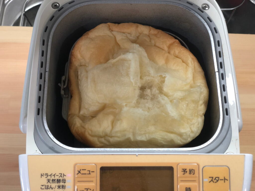 焼成中から発酵の勢いが強く、想像以上に大きく膨らみました。最終的にはパンの上部がホームベーカリーの裏蓋に触れてしまい、焼き上がり後は軽くへばりつく状態に。生地自体は破綻していないものの、明らかに膨らみすぎという印象です。