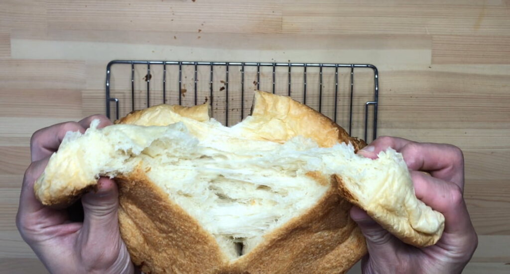 森永 白いダースを使った食パンは発酵が進みやすく、やや膨らみすぎる傾向がありました。生地は柔らかめの食パンに仕上がりました。白いダース由来の甘みと油脂分の影響で生地は軽く、ふんわりとした食感に。通常の食パンと比べるとボリューム感は出やすい。
