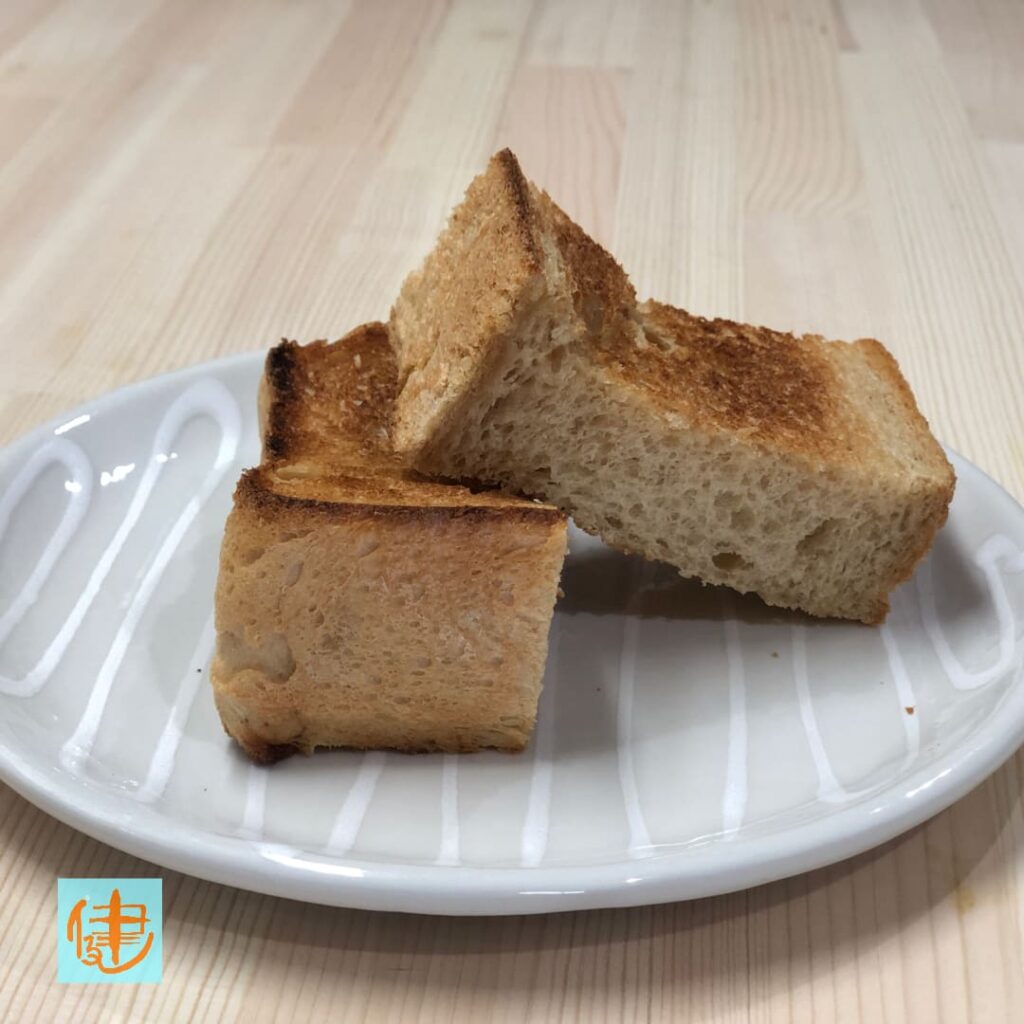 そのまま食べるよりトーストしたときに本領を発揮します。表面、特にミミの部分はしっかりと焼き色が付き、せんべいに近い香ばしさと歯切れの良さが出ました。やや強めに焼くと香ばしさが増し、「柔らかいせんべいを食べているような感覚」で、なかなか面白い食感です。