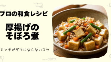 TOPプロの和食レシピ|厚揚げのそぼろ煮|25年目の調理師が教えるミンチがダマにならないコツ 25年以上、和食の世界で腕を磨いてきた調理師の視点から、家庭でも手軽に作れる「厚揚げのそぼろ煮」をご紹介します。プロの料理には必ず「理由」があります。例えば、鶏ミンチを火にかける前に混ぜる一手間。これだけで、仕上がりの口当たりが驚くほど変わ... 2026.02.23TOPよくわかるレシピ煮物