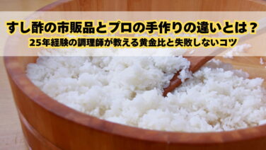 ソース&タレすし酢の市販品とプロの手作りの違いとは?25年経験の調理師が教える黄金比と失敗しないコツ 炊きたてのご飯と混ぜる桶にご飯を入れ、寿司酢を入れる(まんべんなく行きわたるように)ご飯を切るように素早く混ぜる(混ぜすぎるとご飯に粘りが出るので注意する)うちわなどで仰ぐ(時々、上下を入れ替える) 2026.04.05よくわかるレシピソース&タレ