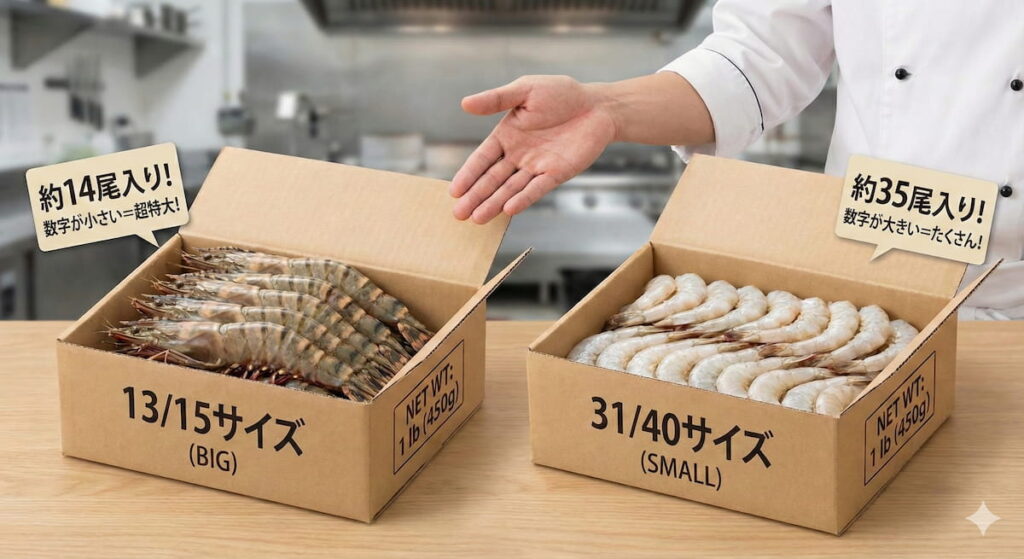 - 有頭エビ: 1.3kgあたりの尾数(※有頭は少し特殊な単位です)