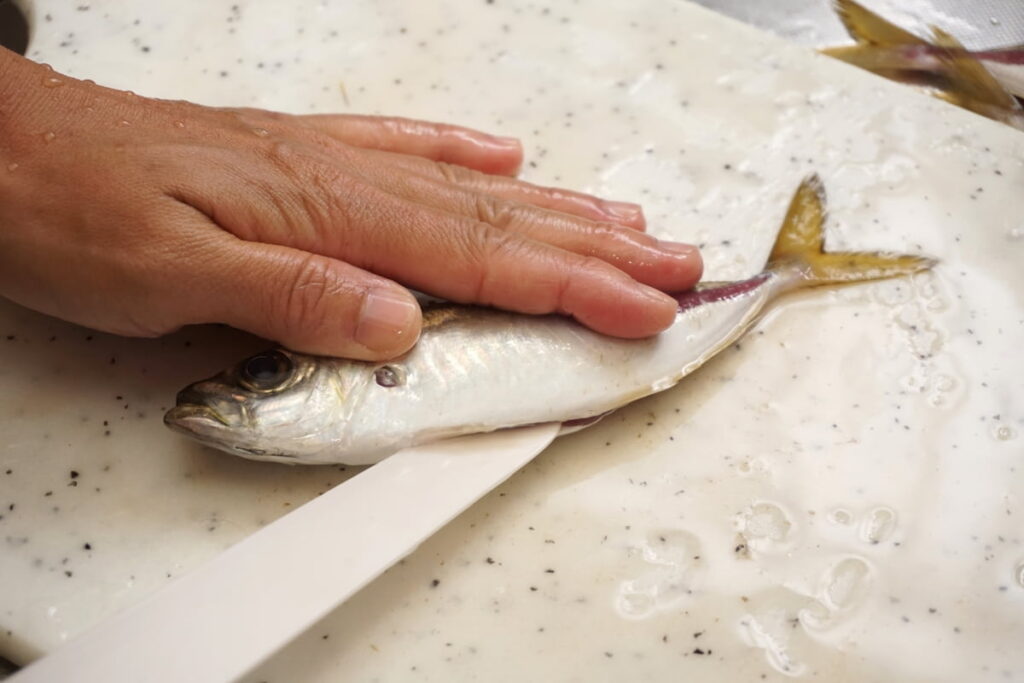 魚の表面や腹腔内に残るぬめりも臭みの原因です。粗塩をまぶして手でこすり、流水でしっかり洗い流します。塩を使うことでぬめりが固まり、落としやすくなります。