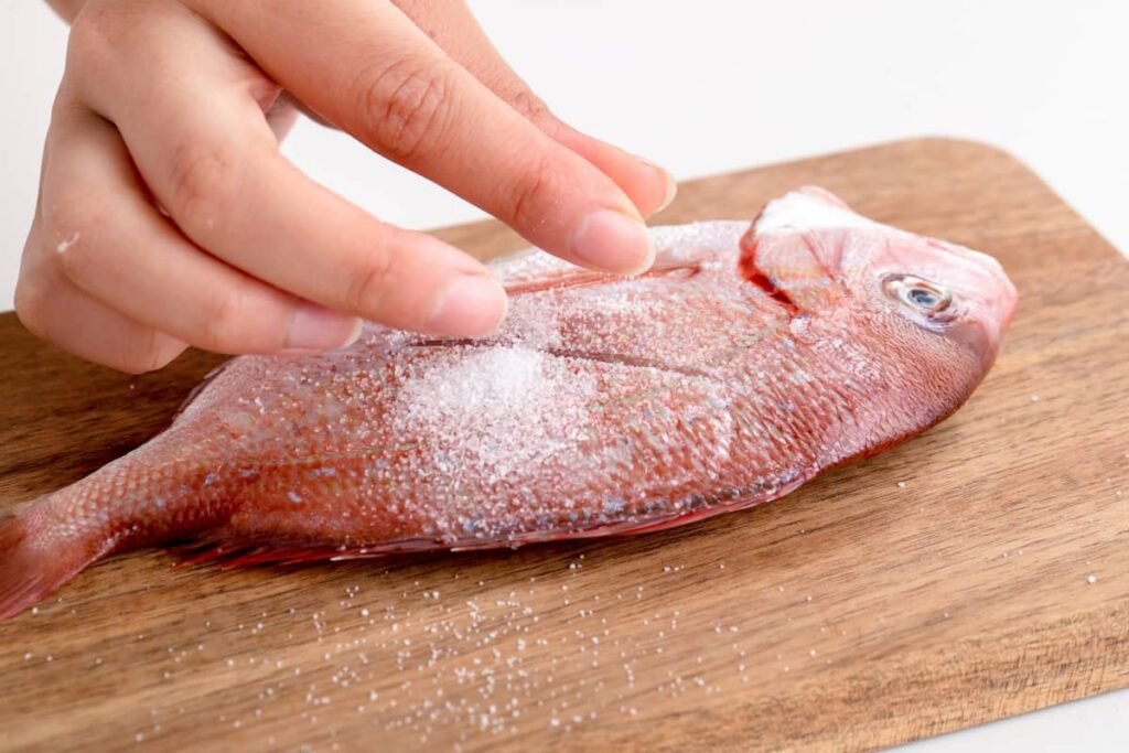 粗塩や天然塩を使うと、浸透圧の効果で臭み取りがより効果的になります。食卓塩でも問題ありませんが、粒が細かいため浸透が早すぎて身が締まりすぎることがあります。