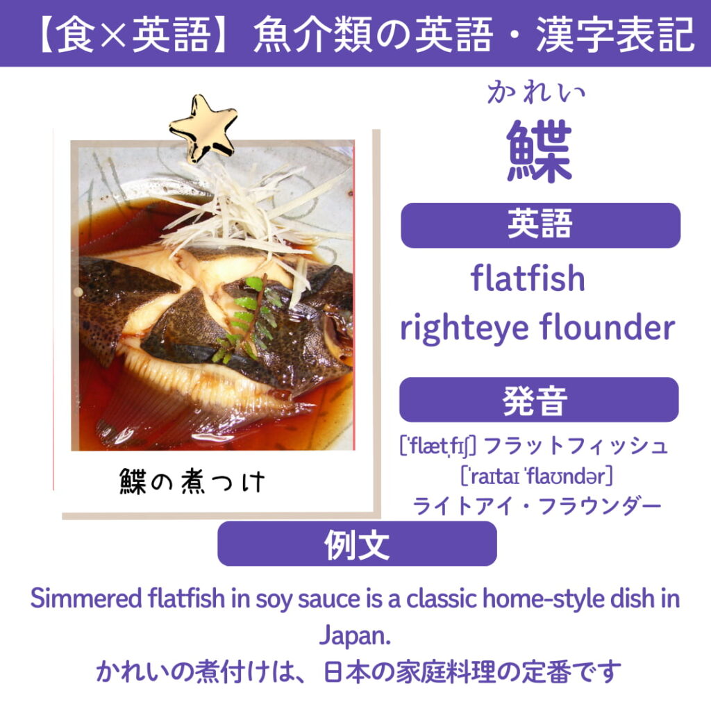 ただし、日本のカレイに相当する具体的な種名は英語圏ではあまり一般的ではないため、料理紹介などでは「grilled flatfish」「braised flounder(煮付け)」など、調理法と合わせて表現するのが一般的です。