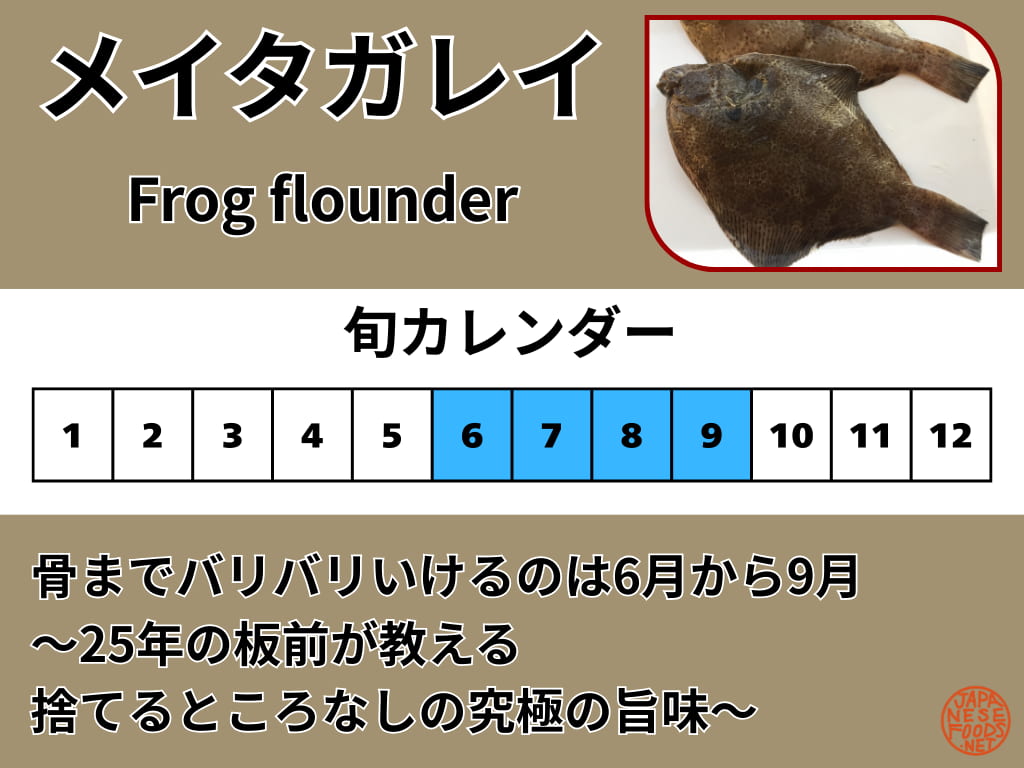 良型ならぜひ刺身(薄造り)に。ポン酢と紅葉おろしで食べると、噛むほどにメイタガレイ特有の香りが鼻を抜けます。小ぶりなものは、二度揚げした「唐揚げ」にすると、頭から骨まで旨味の塊を味わえます。