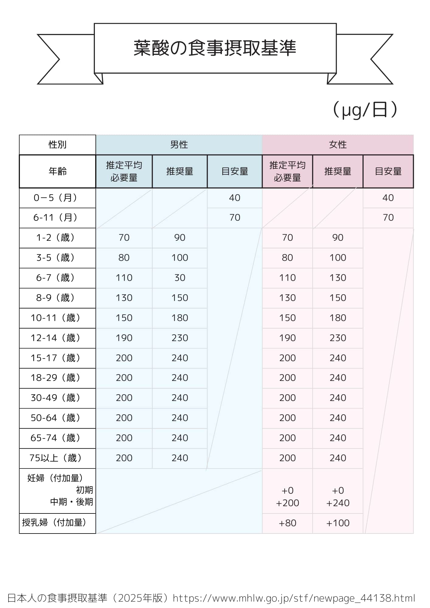 2025年版|葉酸の推奨摂取量(日本人の食事摂取基準)