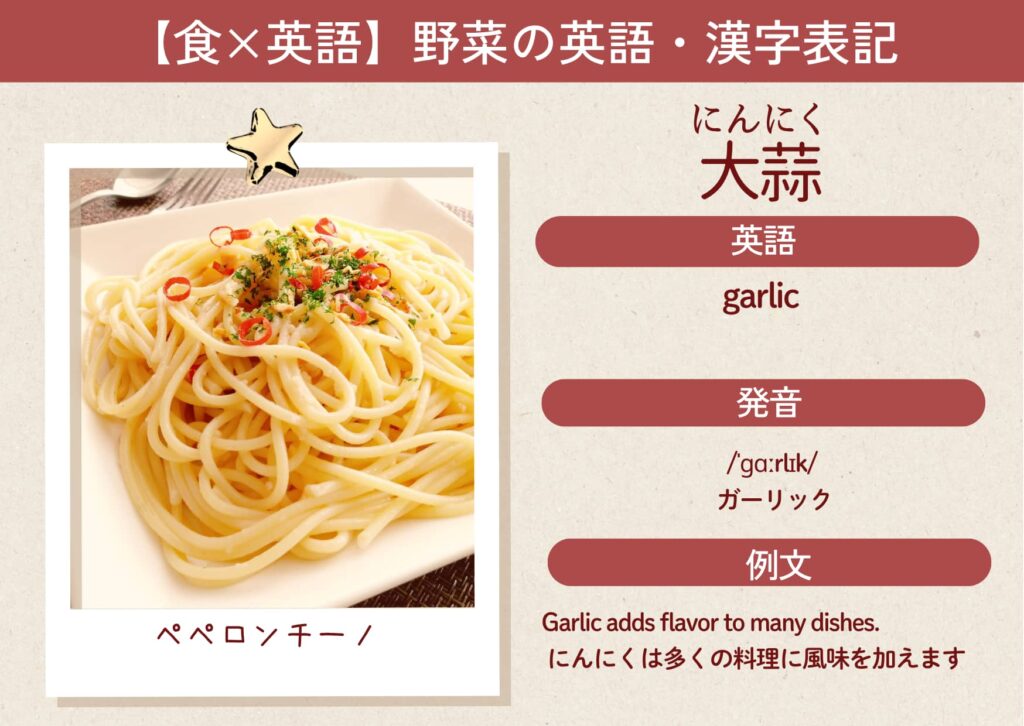 「garlic」は、世界中の料理で使われている香味野菜。英語圏でもよく知られており、スパイスやソースの名前にも頻出します。