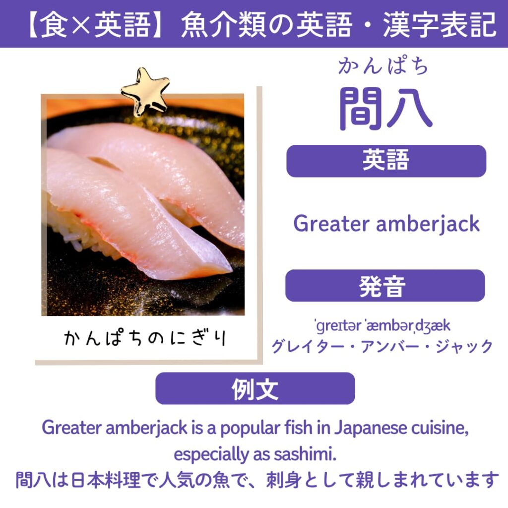 海外では “amberjack” と総称されることも多いですが、“greater amberjack” は日本のかんぱちに近い種。レストランで “Sashimi of greater amberjack” と書かれていたら、それはほぼ“かんぱち”です。