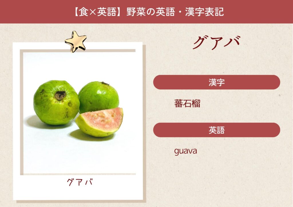英語では「guava(グアバ)」と表記され、世界中で通じる果実名です。特にトロピカルフルーツとして人気があり、ジュースやスムージーなどでもおなじみです。