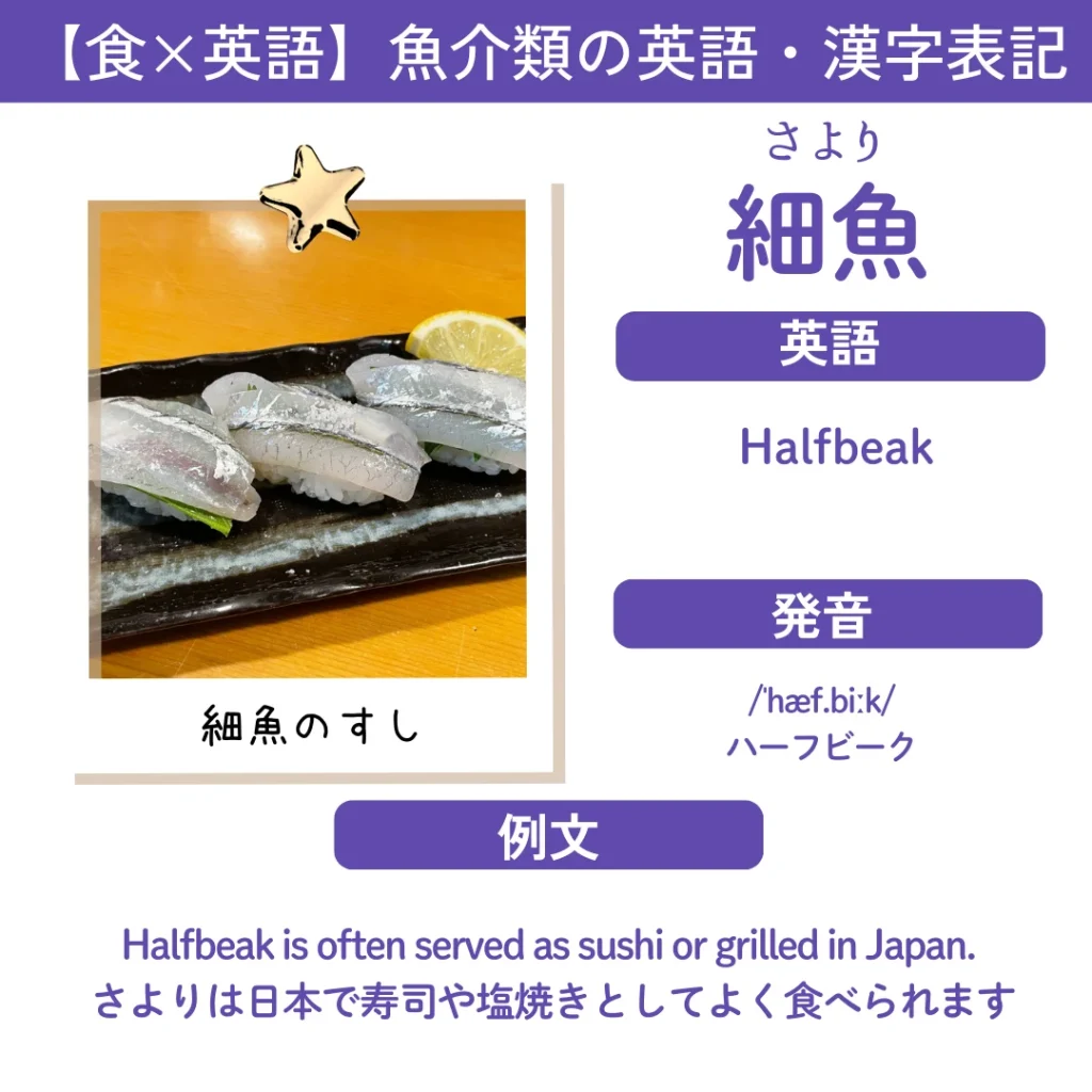 漢字では「鱵」「細魚」「針魚」「針嘴魚」「水針魚」「竹魚」「長鰯」とも書きます