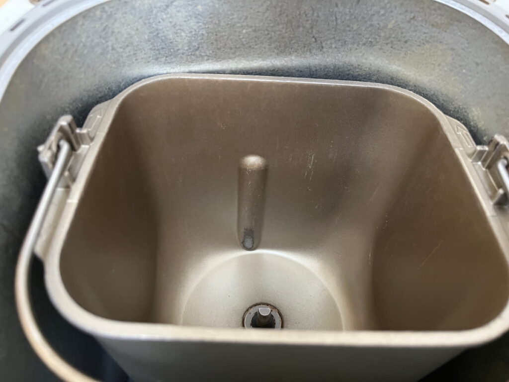 必ず、パンケース(釜)の内側を写した画像を確認してください。表面のフッ素加工が広く剥がれていると、焼き上がったパンがくっついて取り出せなくなってしまいます(私のパンケースは側面の凹凸部分が剥げています)