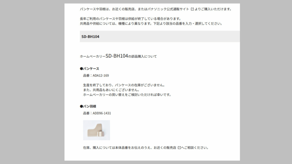 SD-BH104はすでに廃盤モデルです。パンケースは販売できなくなっており、どこかで在庫が余ってない限り購入は出来ません。しかし、パナソニック製品は普及数が多いため、交換パーツが今でもネット上で流通しています。