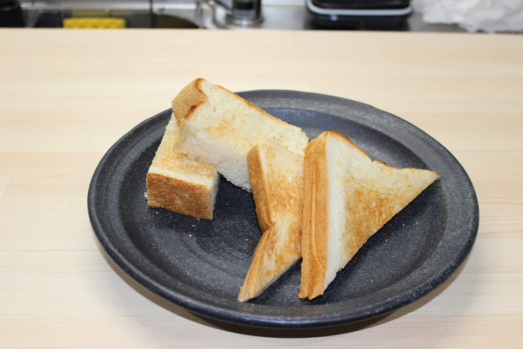 本物との食べ比べ(三角が販売品、四角がホームベーカリー)