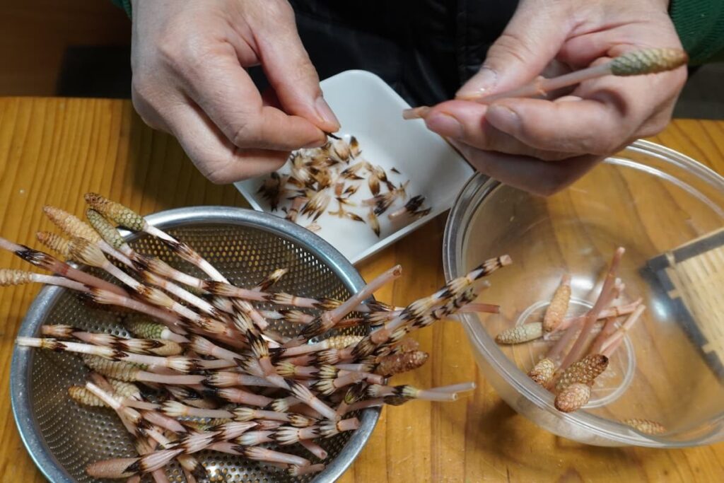 つくしの頭(スギナの胞子嚢)から出る緑色の粉。「カビみたいだけど、そのまま食べてお腹を壊さないの?」と不安になりますよね。