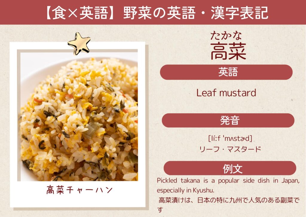 「Takana」は日本で親しまれている葉野菜で、英語では一般的に “Leaf mustard(リーフ・マスタード)” と訳されます。英語圏でも「Takana」という日本語名が使われることもあります。