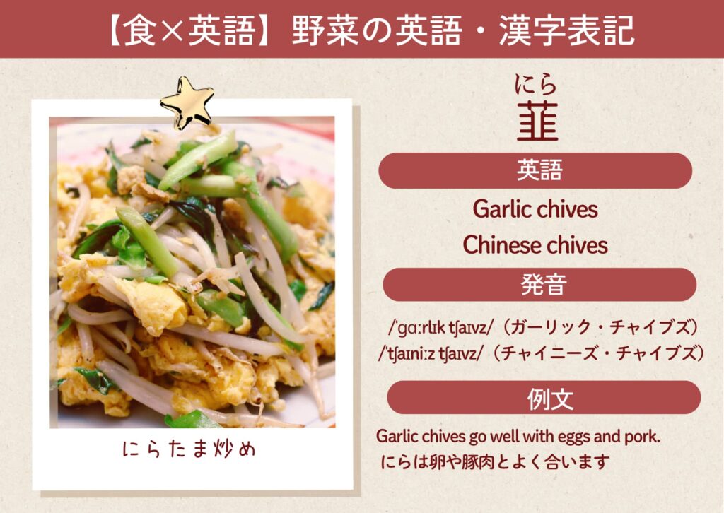 なお、「Leek(リーク)」は西洋ねぎ(ポロネギ)を指すため、日本のにらとは別の野菜です。