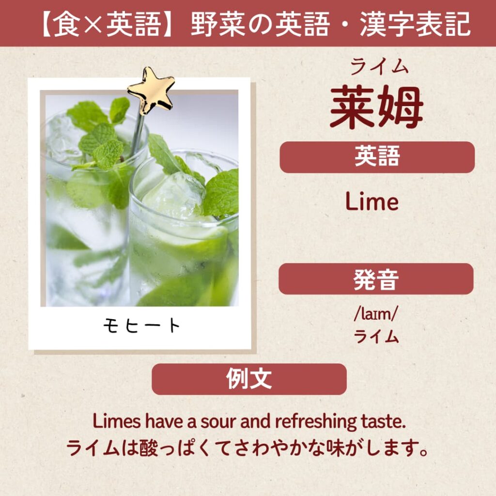 - 漢字表記:一般的に「酸橙(さんとう)」または「莱姆」とも書かれることがありますが、日本ではあまり漢字表記は用いられません。