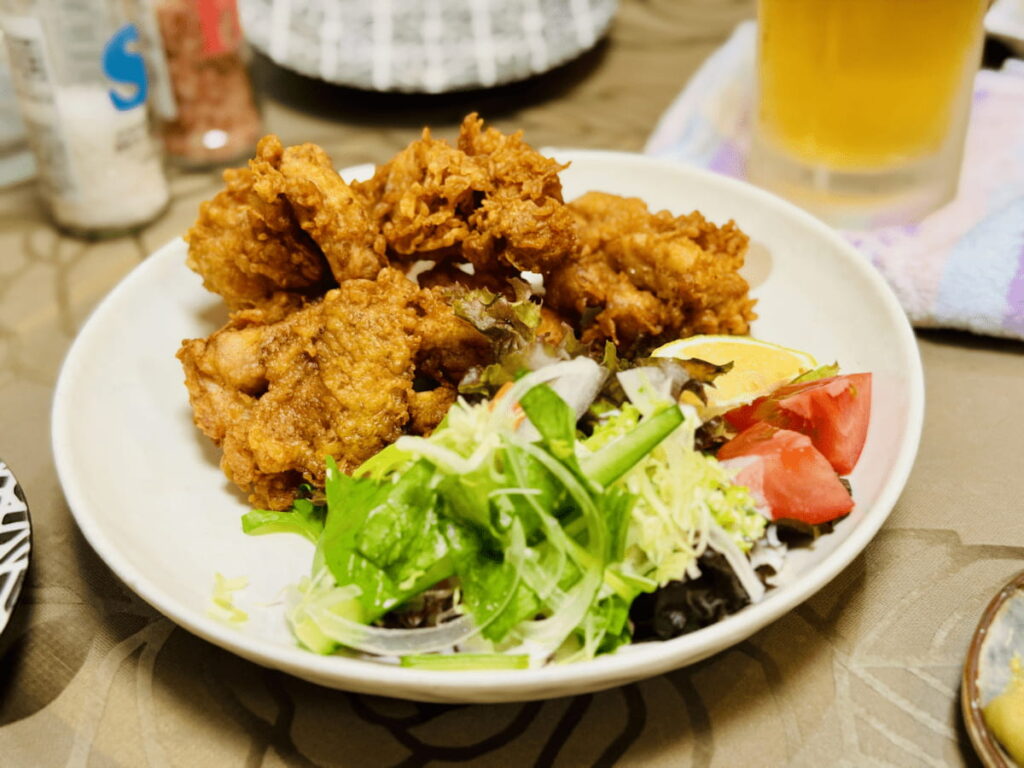 鶏の唐揚げ:ジューシーな脂が明太子の辛さをマイルドにするおかず