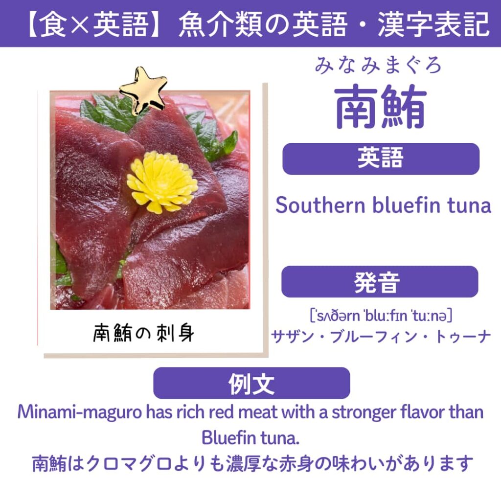 👉 「Southern(南の)」+「bluefin tuna(クロマグロ)」という意味で、直訳すると「南のクロマグロ」というニュアンスになります。