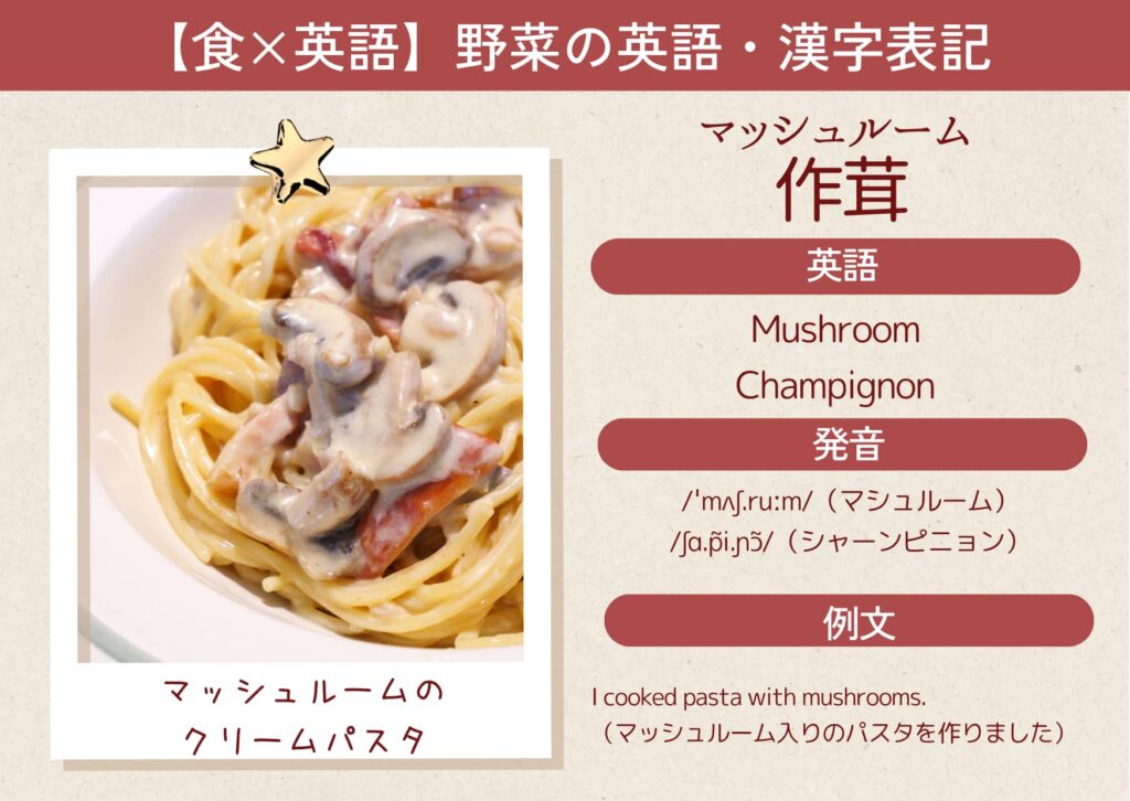 ※「作茸」という表現は一部地域・文献で使用されますが、一般的には漢字表記より「マッシュルーム」とカタカナで表記されることが多いです。