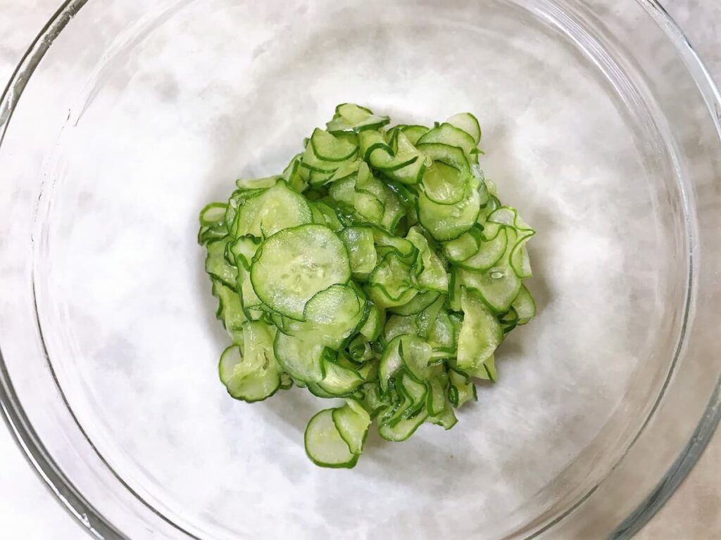 まずは胡瓜と新玉葱をボウルに入れ、塩を振ります。ここで重要なのは、ただ混ぜるのではなく、全体に塩が馴染むよう優しく、かつしっかりと揉み込むこと。 そのまま10分〜15分ほど放置します。野菜からじわじわと水分が出てくるこの時間は、野菜が「お酢を受け入れる準備」をしている時間です。この水分を出し切らないと、後の「おいしい酢」が弾かれてしまいます。