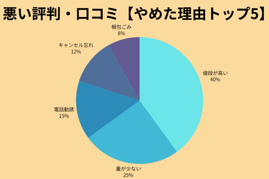 「定期便の仕組み」に関する不満も多数ありました。キャンセルを忘れることで勝手に届きます。
