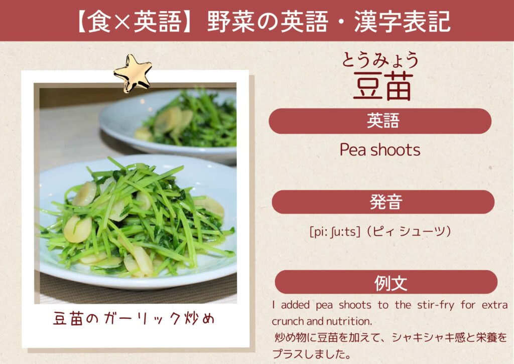 豆苗は英語で「Pea shoots(ピィ・シューツ)」と表記されます。これは「エンドウ豆(pea)」の「若い芽(shoots)」を意味し、主に英語圏では中華料理やヘルシー志向の料理でよく登場します。発音は「[piː ʃuːts]」で、日本語では「ピィ・シューツ」となり、サラダや炒め物などで使われることが多い食材です。