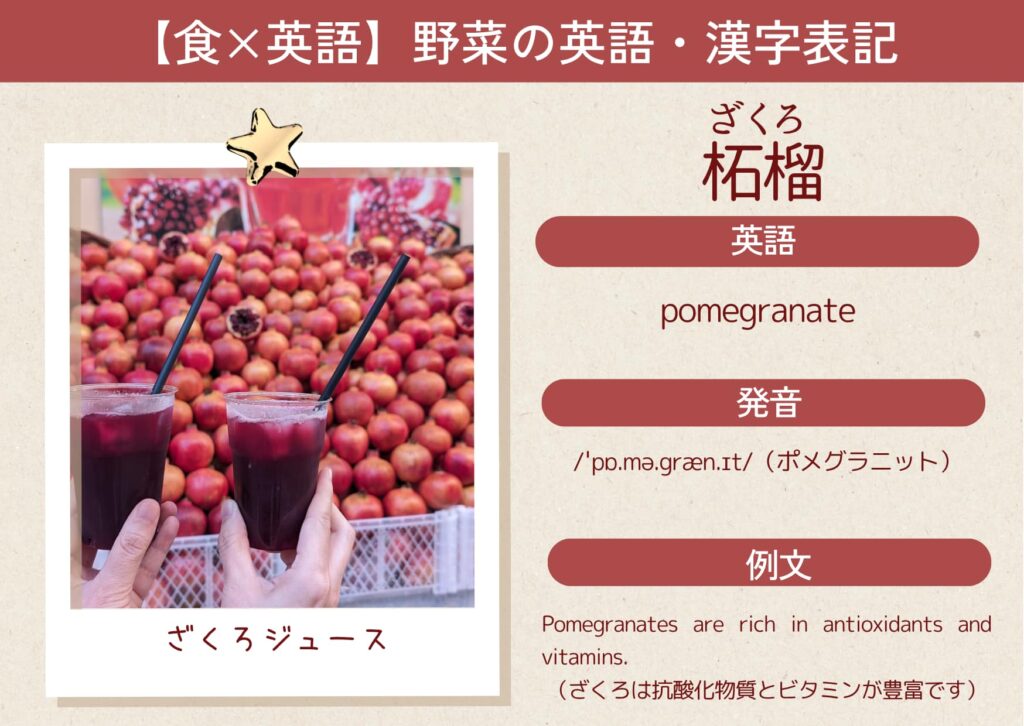 ざくろは漢字で「柘榴(ざくろ)」と書きます。英語ではpomegranate(ポメグラネイト)と呼ばれ、ジュースやスムージーなどでよく使われる果物としても知られています。