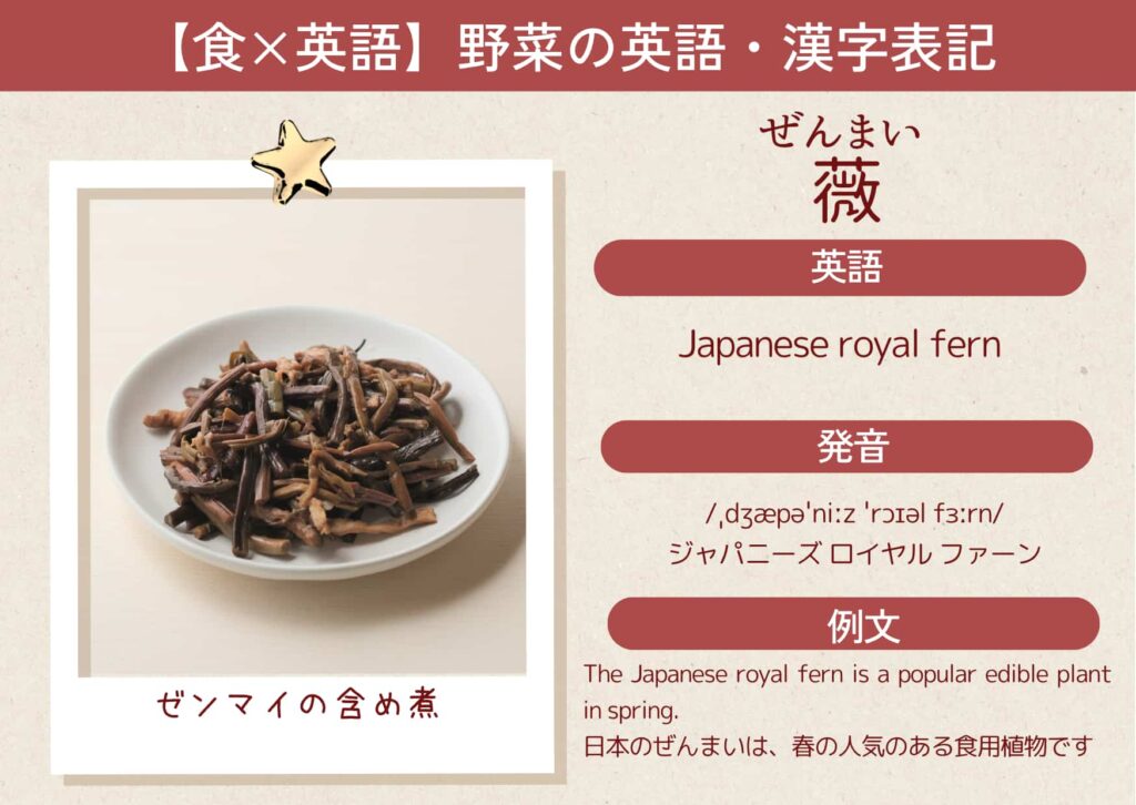 ぜんまいの英名はJapanese royal fernまたはJapanese flowering fernとなります。