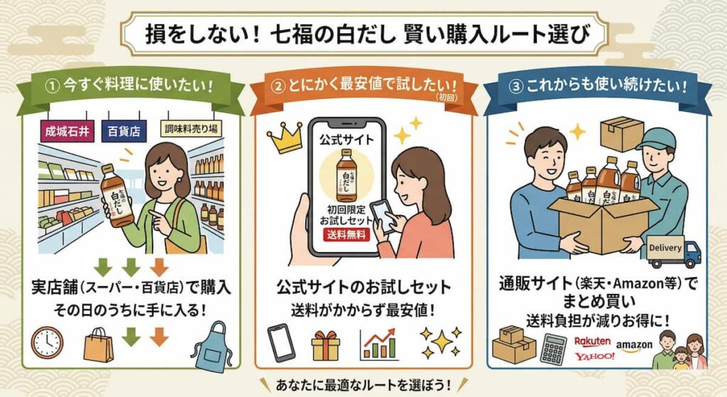 「七福の白だし」を買いたいけれど、どこが一番お得な販売店なのか迷っていませんか?