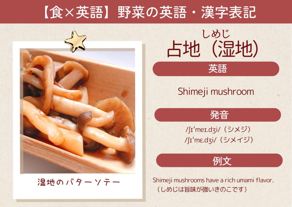 | しめじ | 湿地 | Shimeji mushroom | /ʃɪˈmeɪ.dʒi/ または /ʃɪˈmɛ.dʒi/ | シメジ/シメイジ |