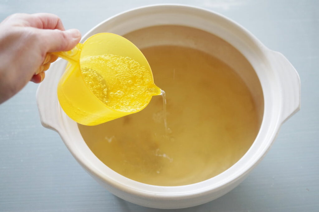 白菜などの野菜から出る水分を計算し、つゆは少し濃いめに作ることが重要です。一般的な白だしの場合、「白だし1:水13~14」の割合が黄金比となります。通常のうどんつゆなどよりも少し濃く設定するのがポイントです。