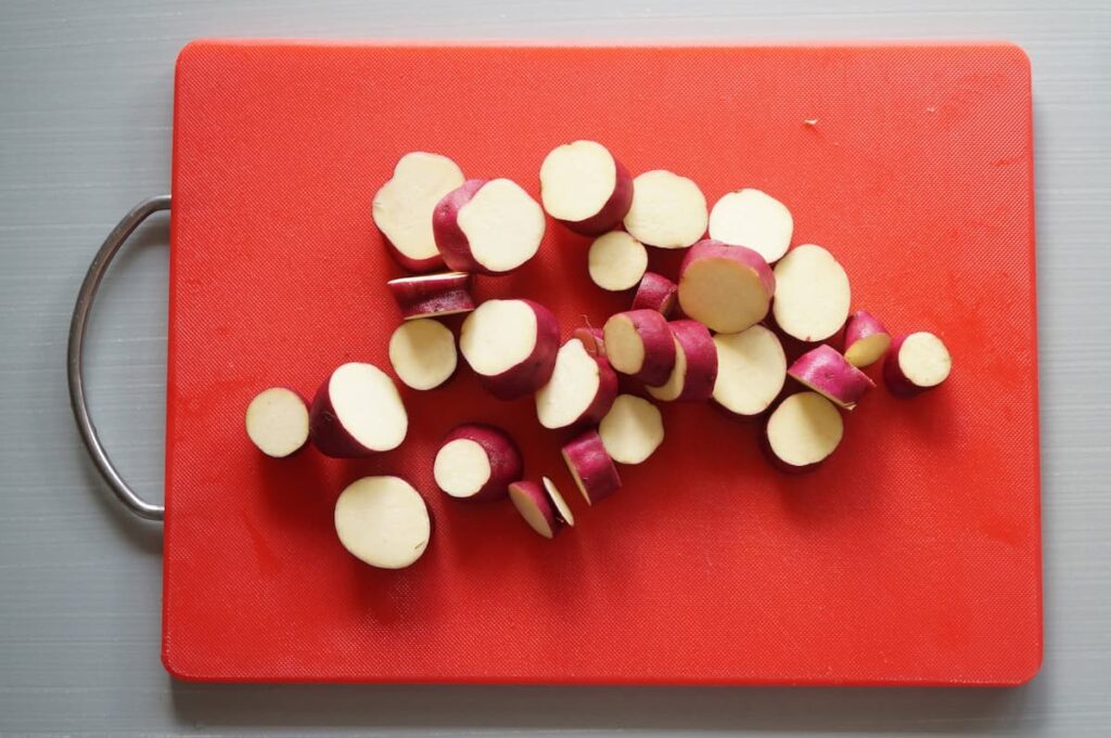 | 薩摩芋 | 皮をむかずによく洗い、1〜2cmの輪切り。水に10分さらしてアク抜き。 |