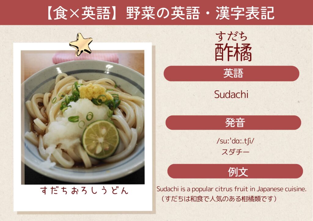英語では一般的に 「Sudachi(スダチ)」と表記され、Yuzu(ゆず)やKabosu(かぼす)と並ぶ日本固有の香酸柑橘として、海外でも注目されています。
