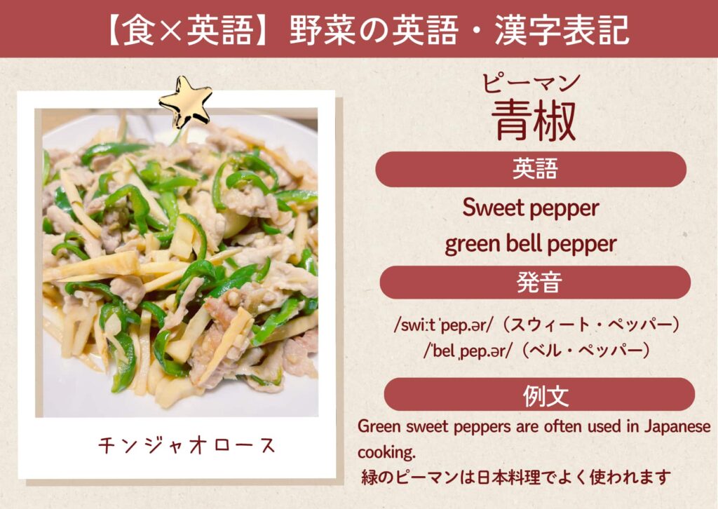 ※緑色のピーマンは「green sweet pepper」や「green bell pepper」とも呼ばれます。