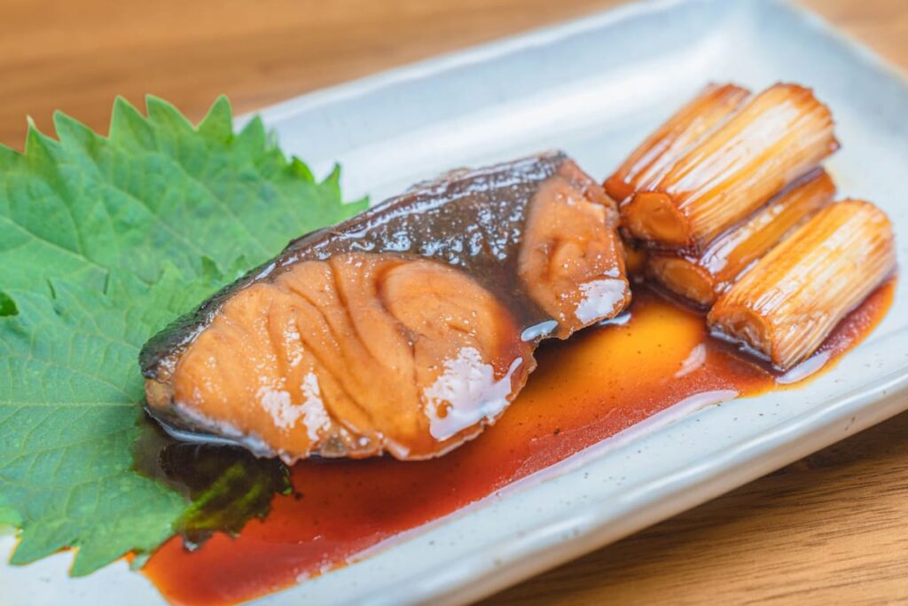 (これは煮付けで、生姜入りの甘い醤油ベースのタレで魚を煮込んだものです) - 照り焼きの説明