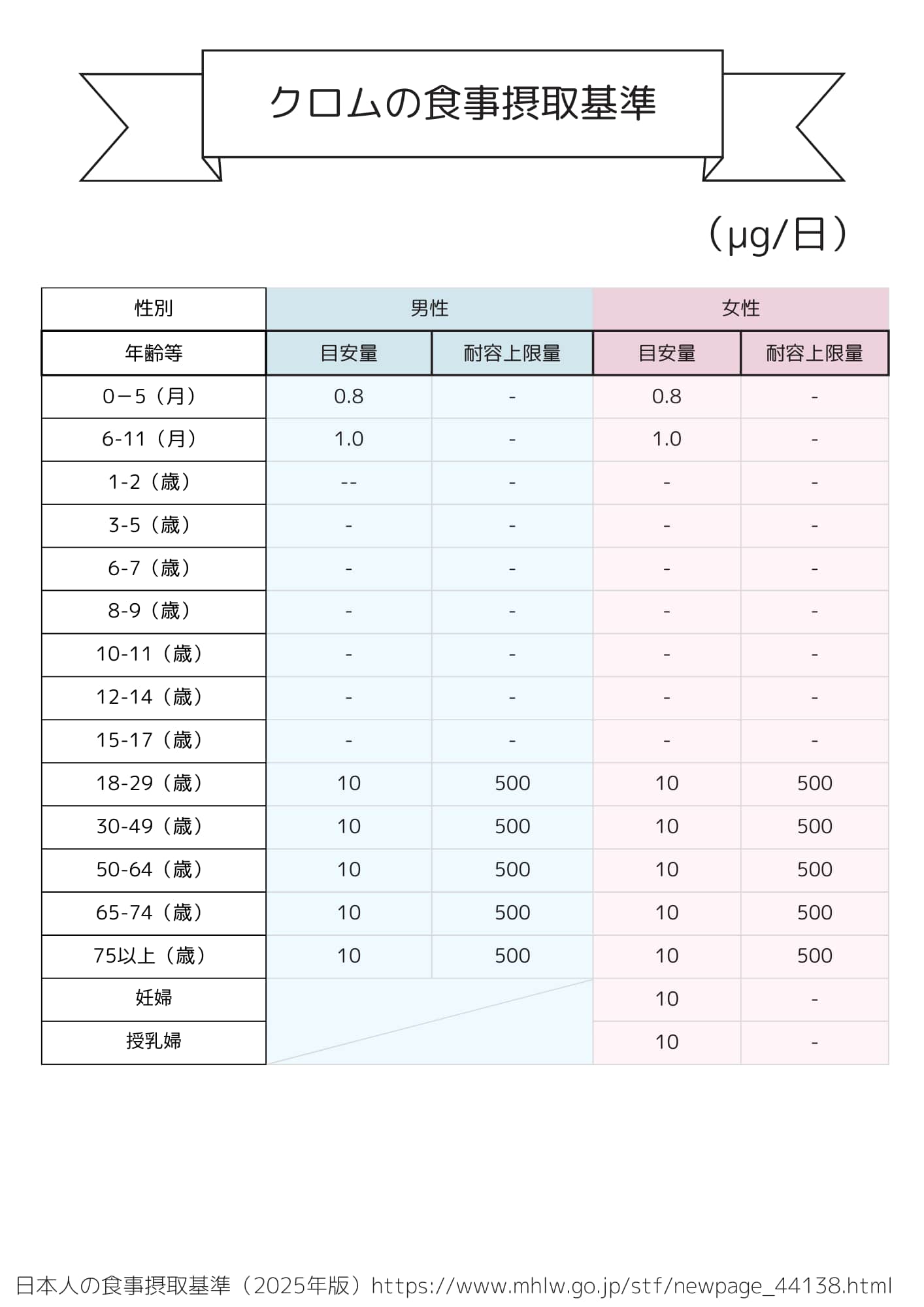 クロムの食事摂取基準|年齢・性別別の必要量を解説!