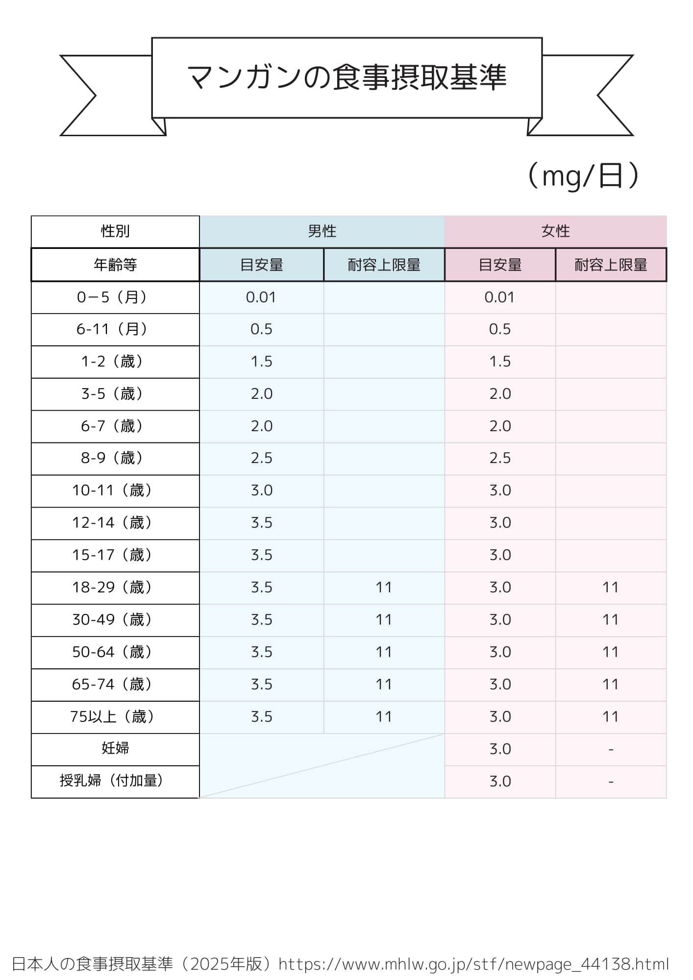 日々の食事でバランスよく栄養を摂るための参考として、**厚生労働省が公表している「日本人の食事摂取基準(2025年版)」**に基づき、マンガンの必要量を以下の表にまとめました。