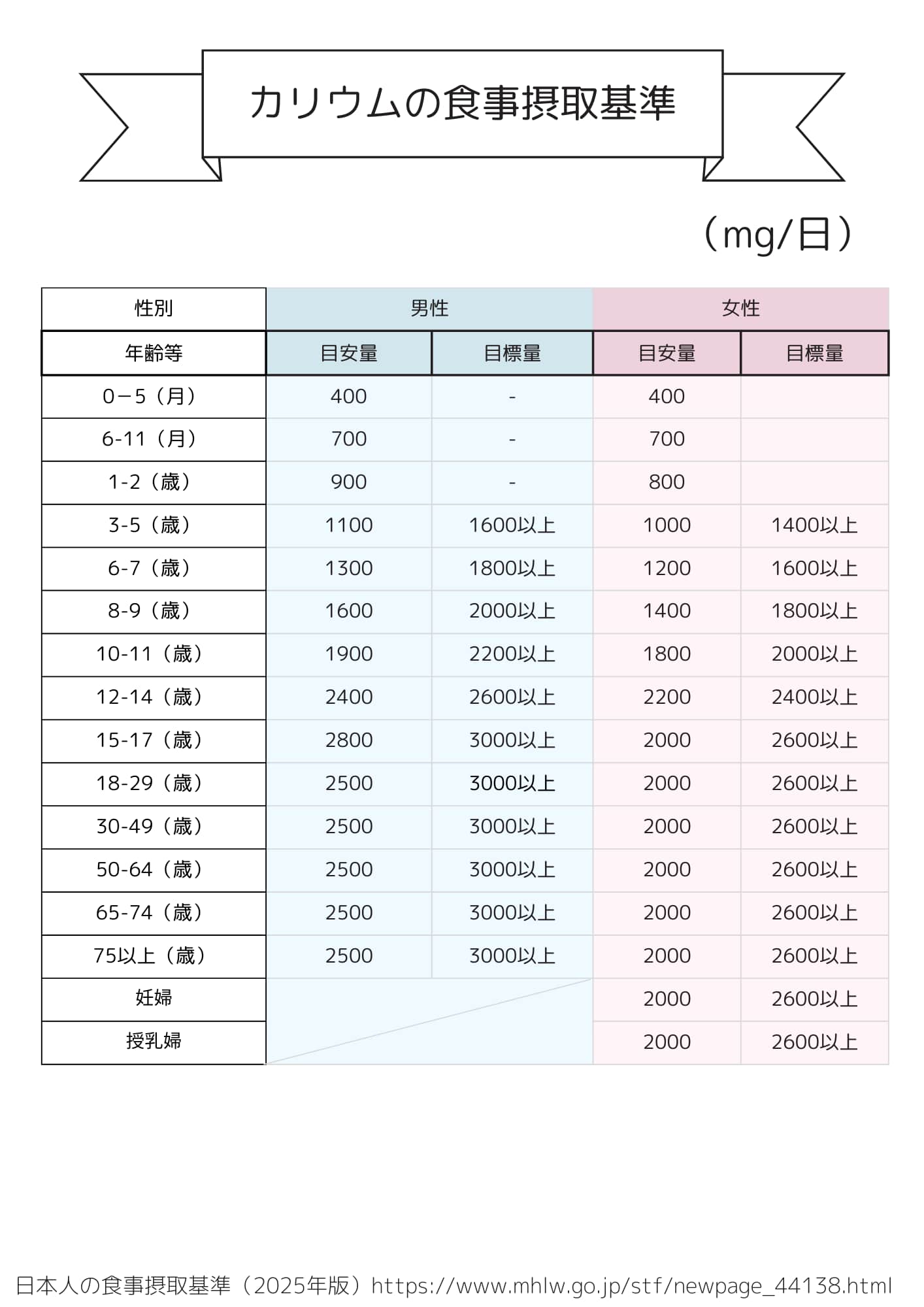 📌 参考:食事摂取基準におけるカリウムの「目標量(mg/日)」