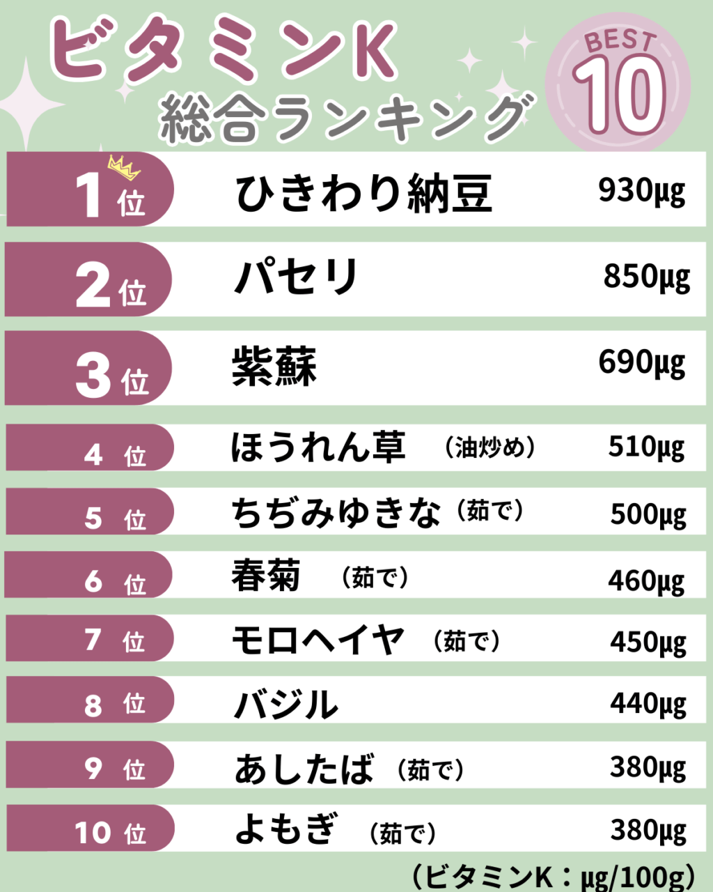ただしビタミンKはパセリや紫蘇(しそ)など“薬味”が上位に出やすい栄養素でもあります。