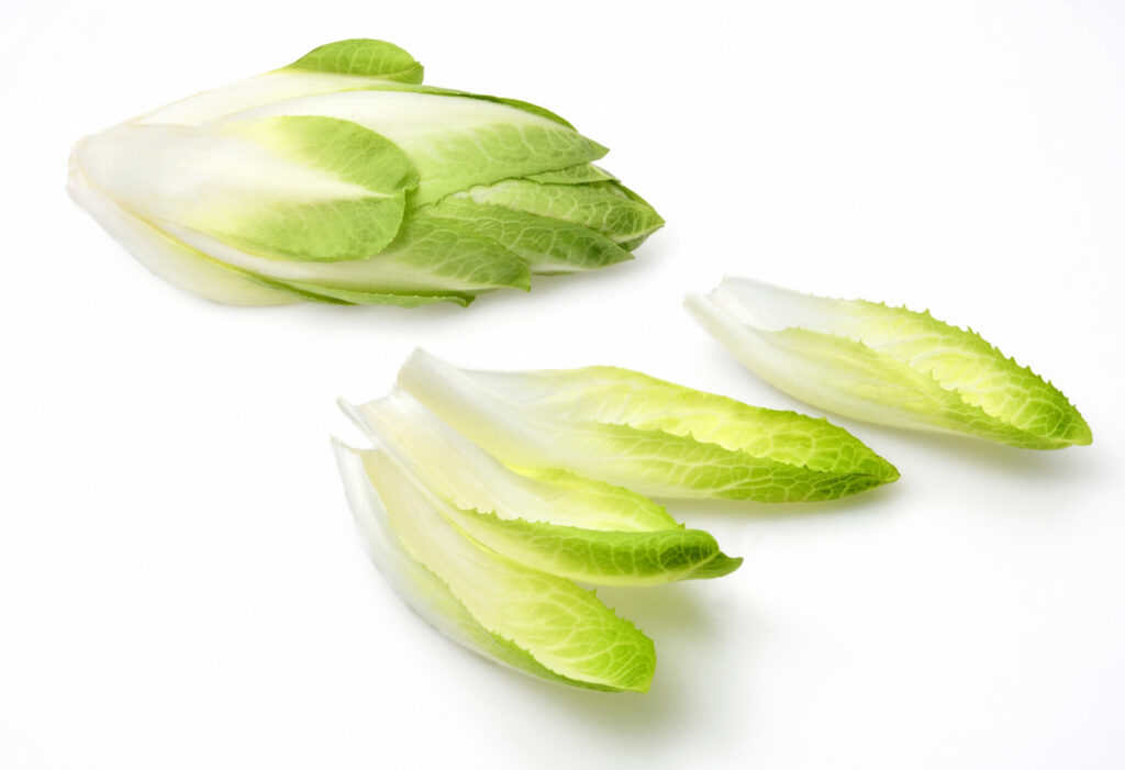 11月~3月(冬が旬。長野、岡山などが主な産地。ヨーロッパ原産の野菜で、軟白栽培された白い葉が特徴です。ほろ苦い味わいが大人の味として人気です)